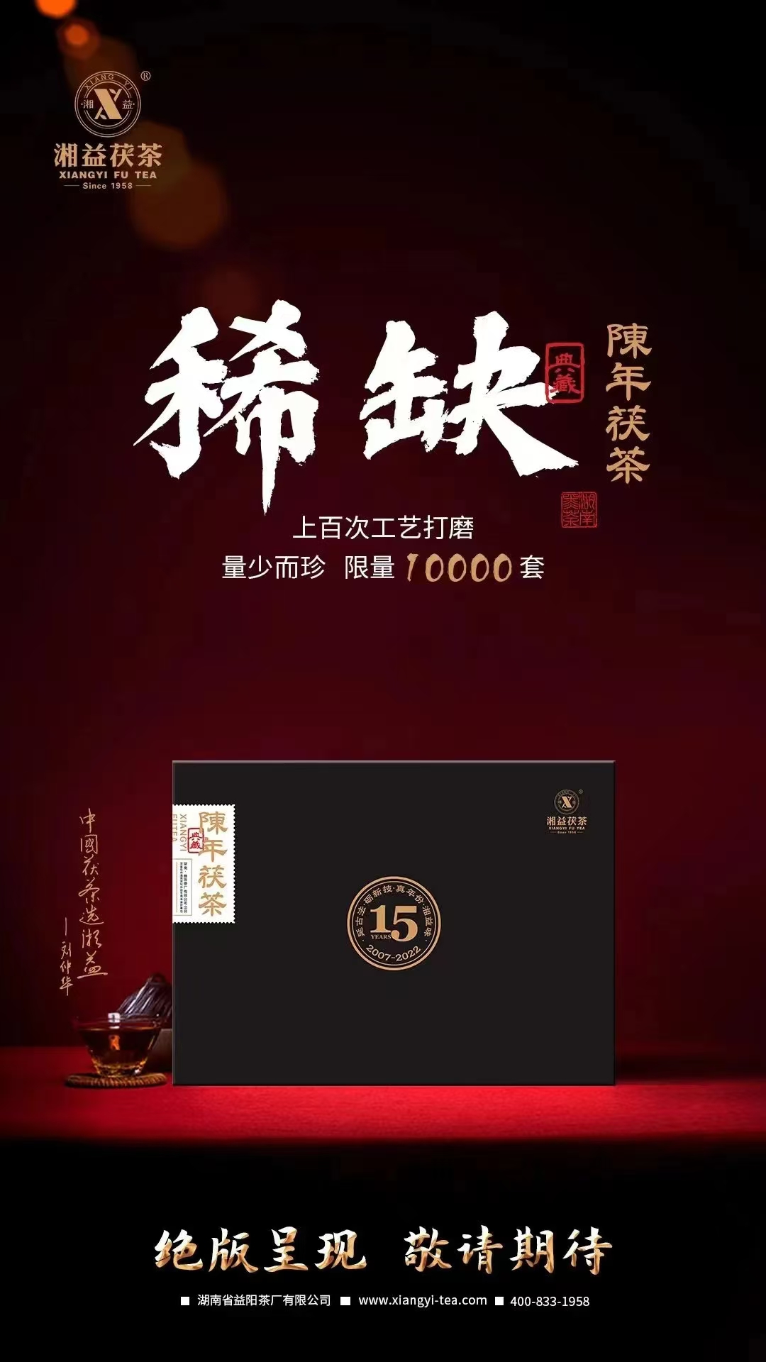 因其原料的稀缺,加之采用一口料制作,?陳年茯茶?限量發(fā)售10000套。每套均有獨立編號和典藏證書(shū),并有劉杏益大師的親筆簽名。當下品飲,即可享受15年時(shí)光釀就的陳醇好味;投資收藏,保值升值空間十分巨大,未來(lái)可期。
