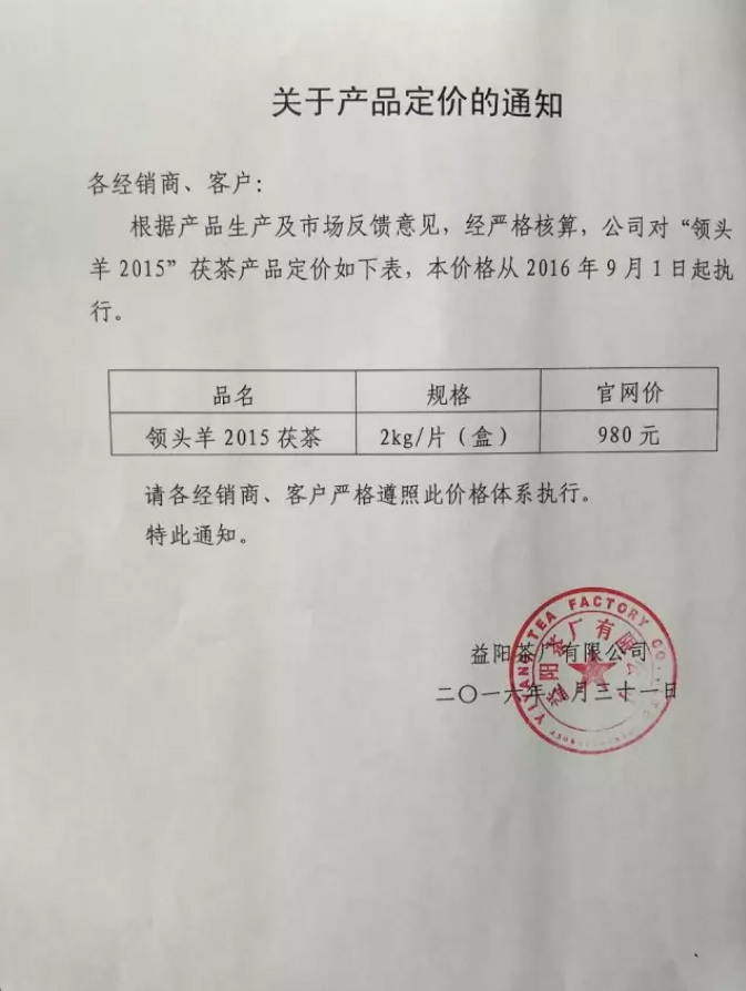 根據產(chǎn)品生產(chǎn)及市場(chǎng)反饋意見(jiàn),經(jīng)嚴格核算,公司對“領(lǐng)頭羊2015”茯茶產(chǎn)品定價(jià)如下表,本價(jià)格從2016年9月1日起執行。